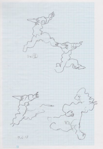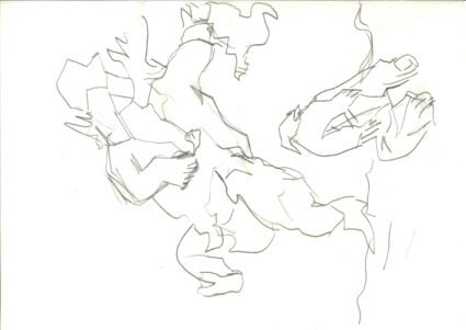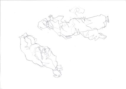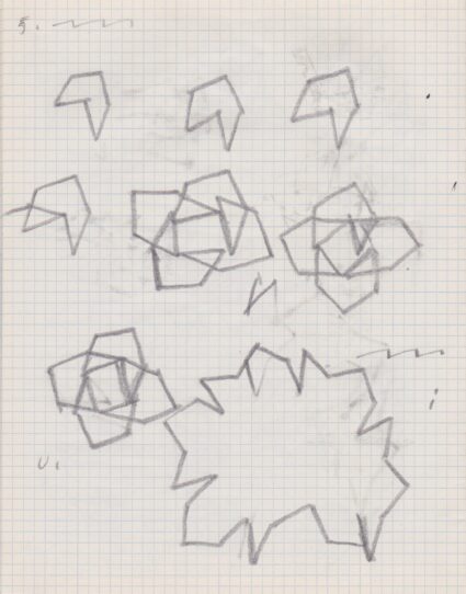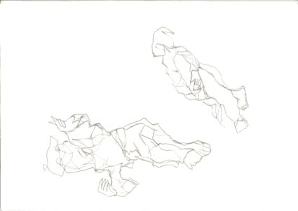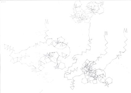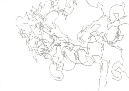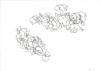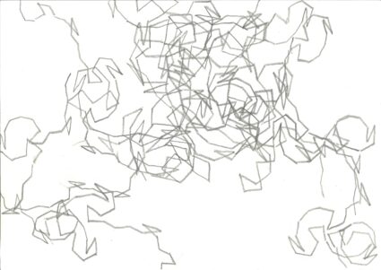 Choreografien mit den 6 Winkel verlaufen entweder kreisförmig oder laufen geradeaus. Diese zwei Kategorien generieren zahlreiche Varianten. Wird die Linie von Hand, ohne Hilfsmittel gezeichnet, ist ein unberechenbarer Verlauf die Regel. Schon kleine Abweichungen entsprechen nicht mehr der geometrischen Idee. Die entstandenen Netzstrukturen trösten mit Szenarien bewegter Figuren. Die Fragilität dieser Motive drückt sich im blitzartigen Auftauchen und gleichzeitigem Verschwinden aus. Interessant ist, dass die festgehaltenen Figuren wandelbar sind. Sie können aus allen vier Positionen zu neuen Gestalten mutieren.