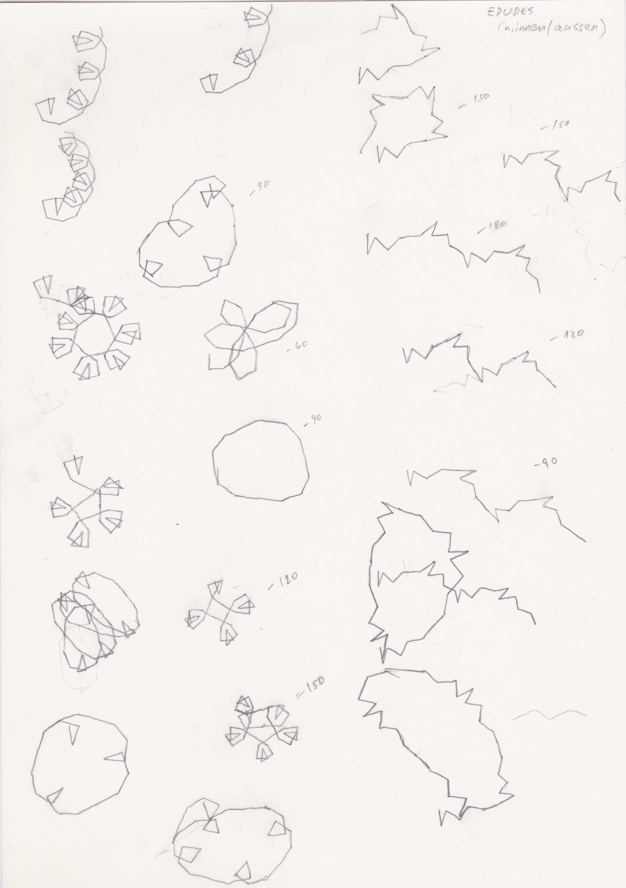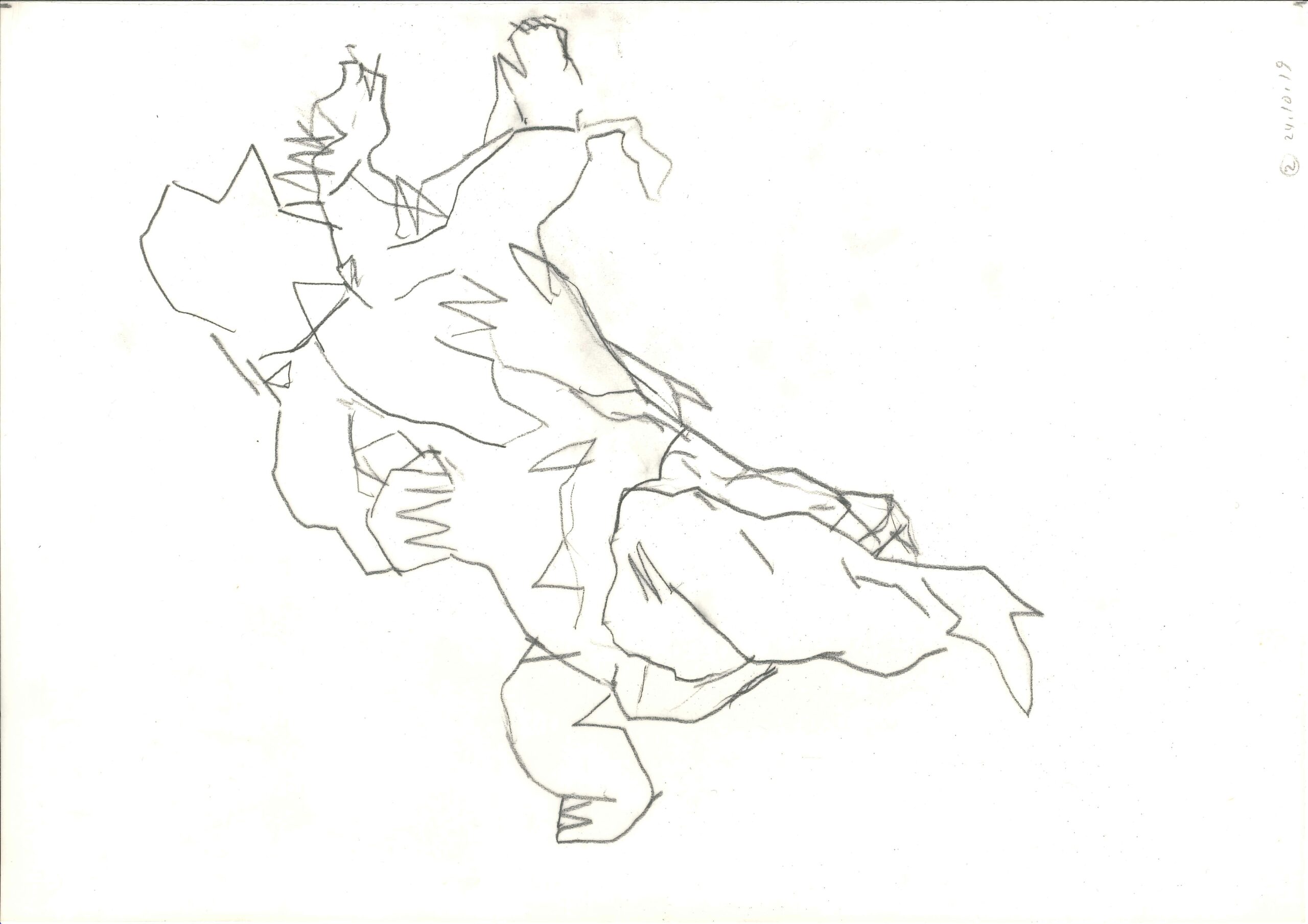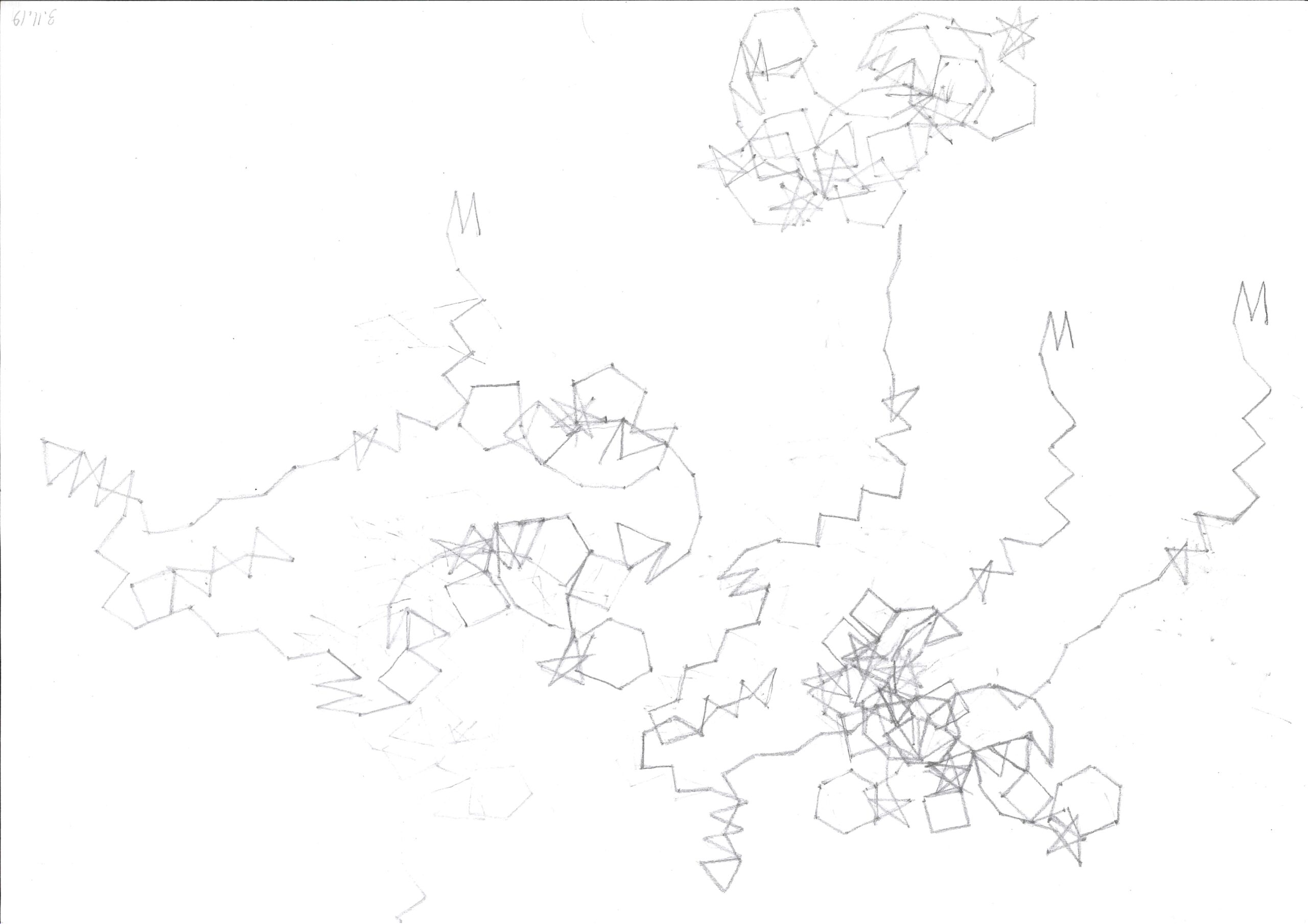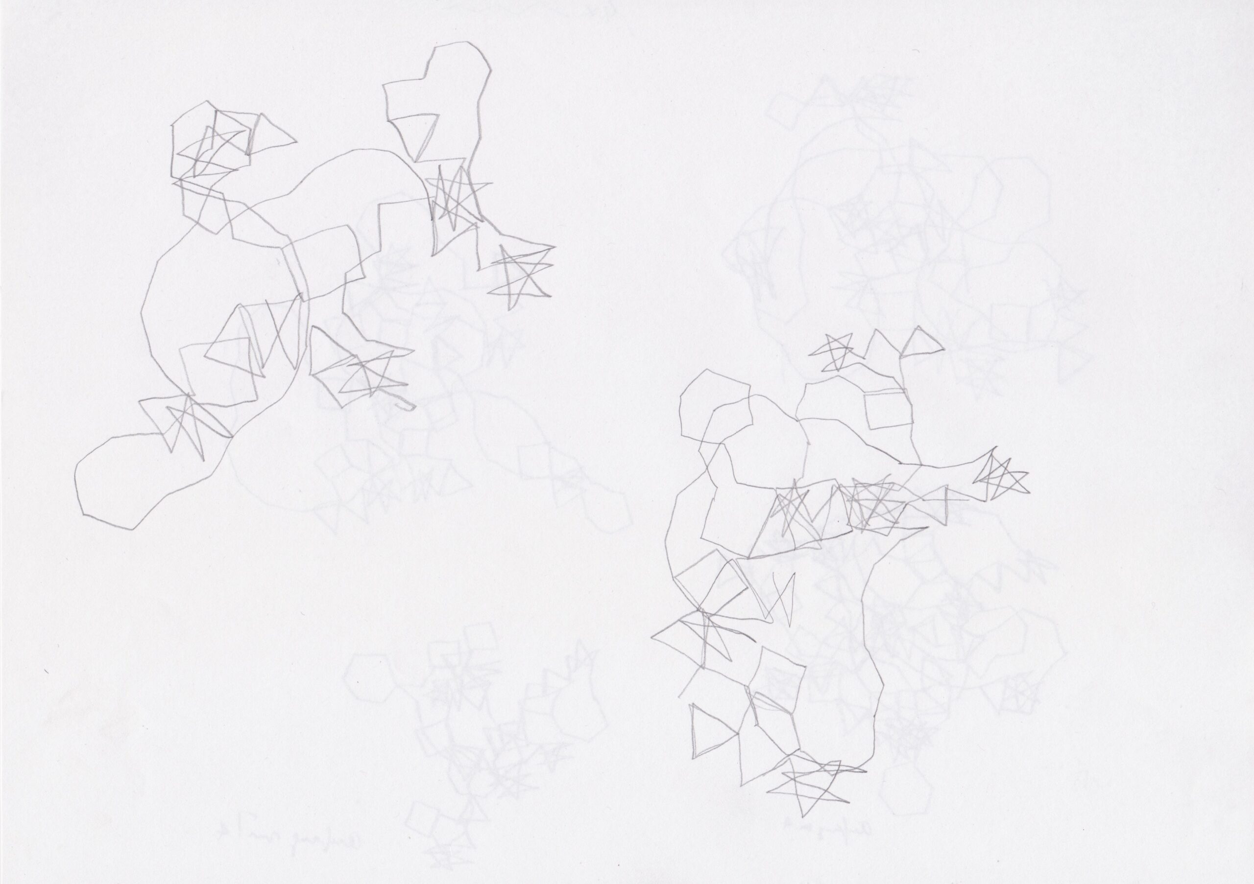 Choreografien mit den 6 Winkel verlaufen entweder kreisförmig oder laufen geradeaus. Diese zwei Kategorien generieren zahlreiche Varianten. Wird die Linie von Hand, ohne Hilfsmittel gezeichnet, ist ein unberechenbarer Verlauf die Regel. Schon kleine Abweichungen entsprechen nicht mehr der geometrischen Idee. Die entstandenen Netzstrukturen trösten mit Szenarien bewegter Figuren. Die Fragilität dieser Motive drückt sich im blitzartigen Auftauchen und gleichzeitigem Verschwinden aus. Interessant ist, dass die festgehaltenen Figuren wandelbar sind. Sie können aus allen vier Positionen zu neuen Gestalten mutieren.