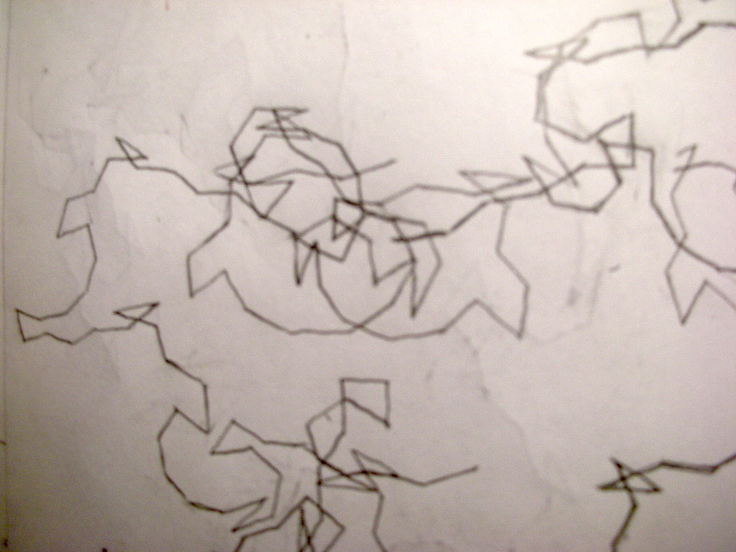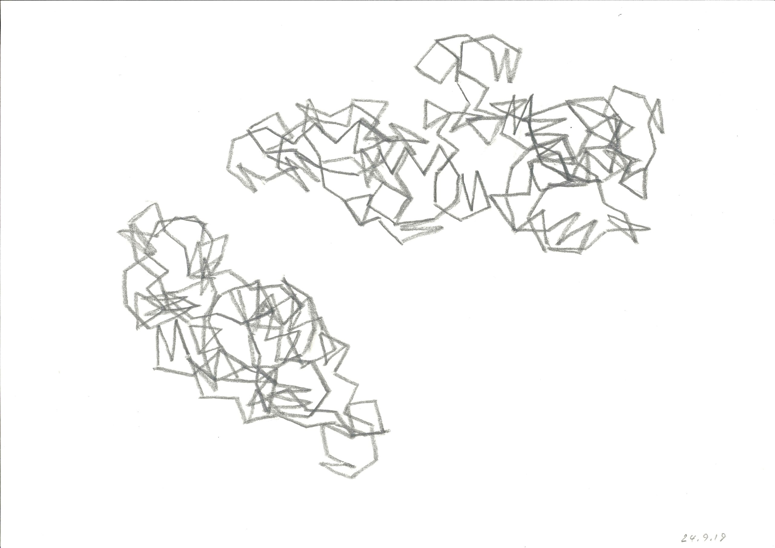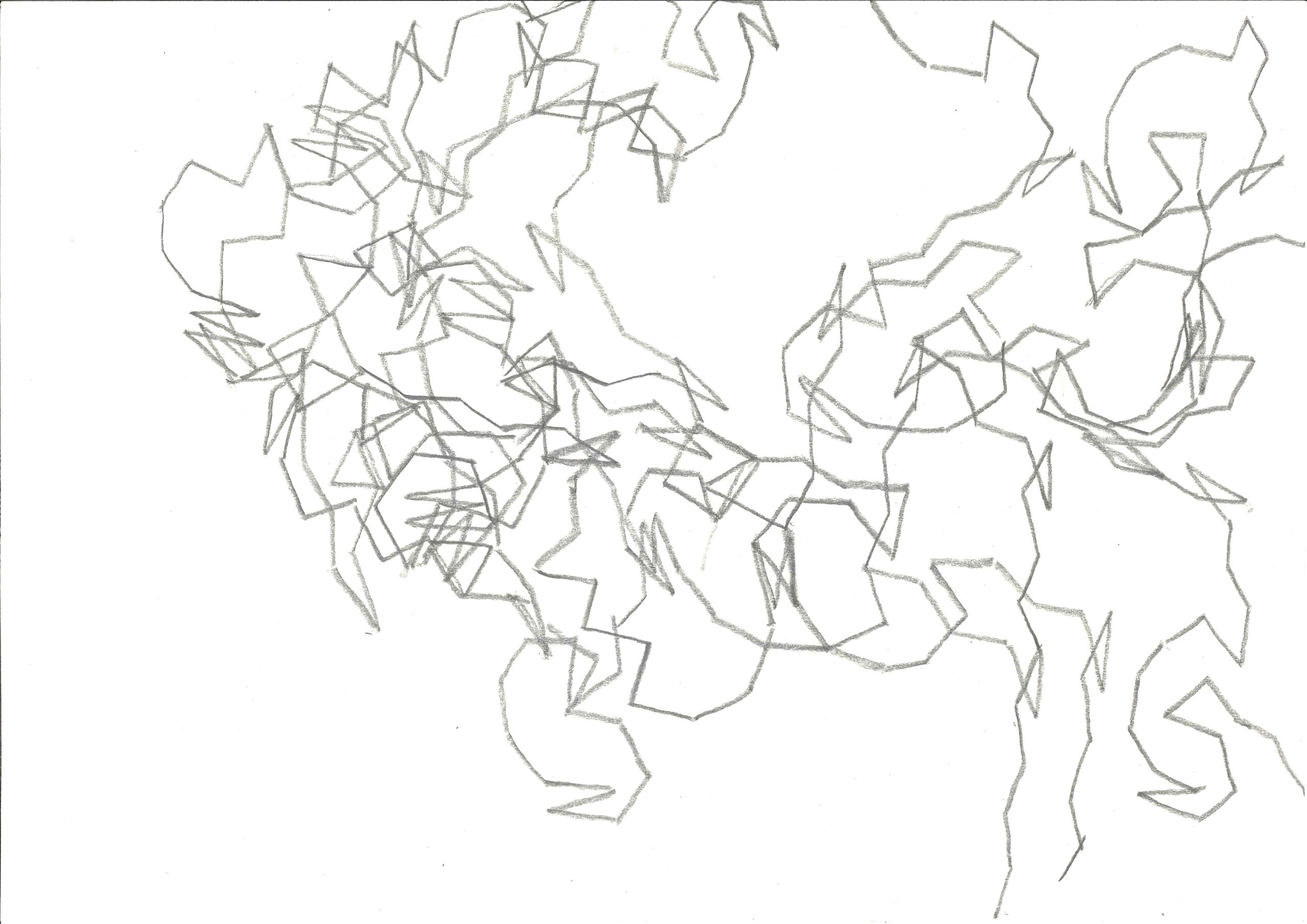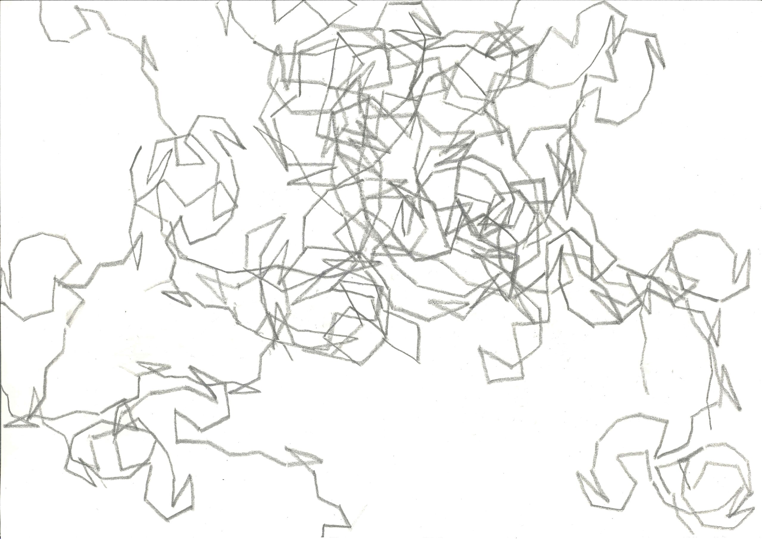Choreografien mit den 6 Winkel verlaufen entweder kreisförmig oder laufen geradeaus. Diese zwei Kategorien generieren zahlreiche Varianten. Wird die Linie von Hand, ohne Hilfsmittel gezeichnet, ist ein unberechenbarer Verlauf die Regel. Schon kleine Abweichungen entsprechen nicht mehr der geometrischen Idee. Die entstandenen Netzstrukturen trösten mit Szenarien bewegter Figuren. Die Fragilität dieser Motive drückt sich im blitzartigen Auftauchen und gleichzeitigem Verschwinden aus. Interessant ist, dass die festgehaltenen Figuren wandelbar sind. Sie können aus allen vier Positionen zu neuen Gestalten mutieren.