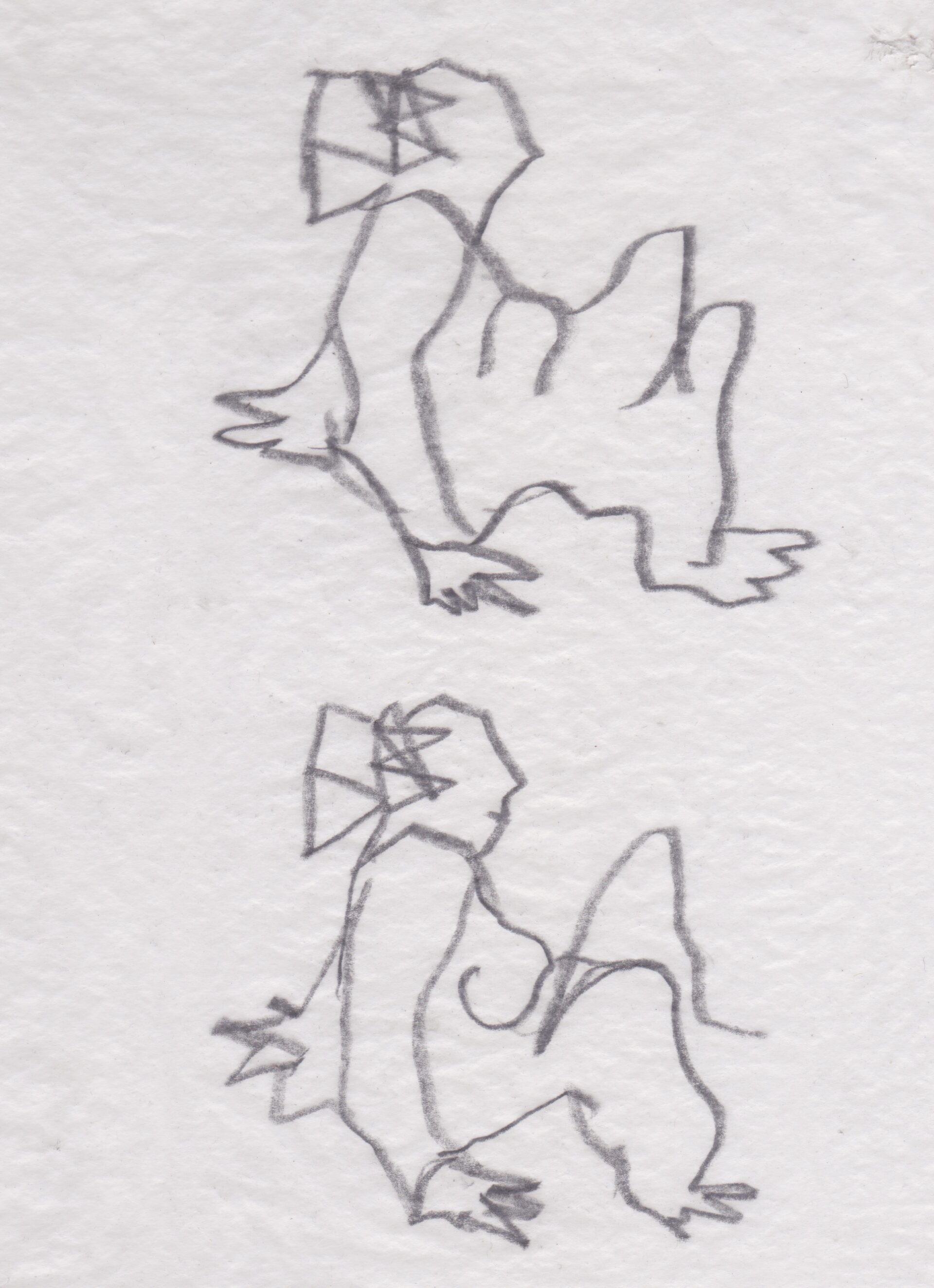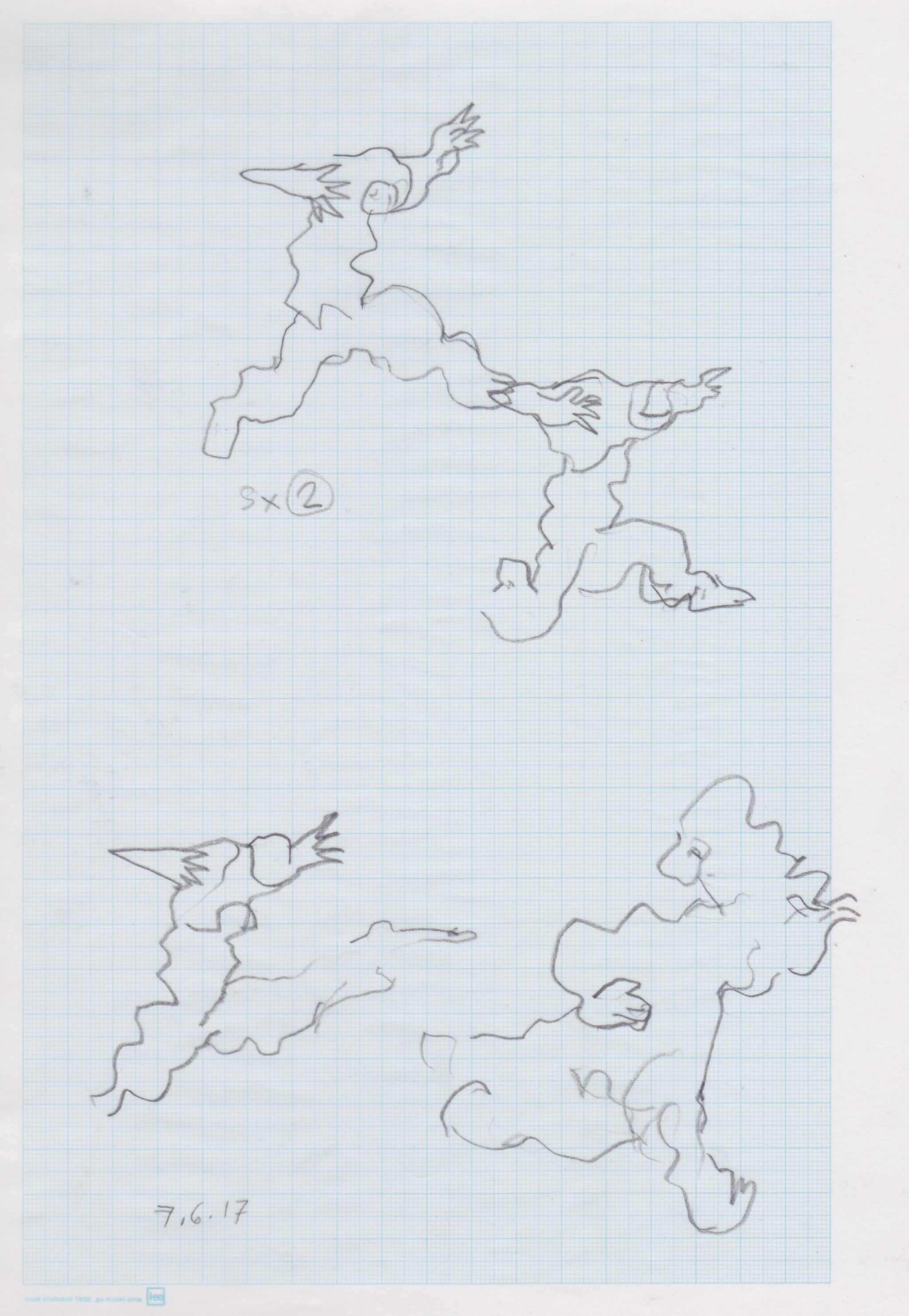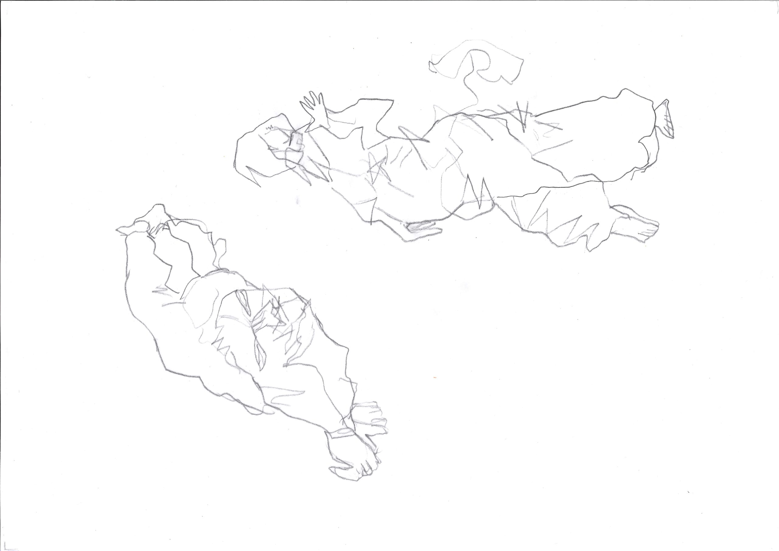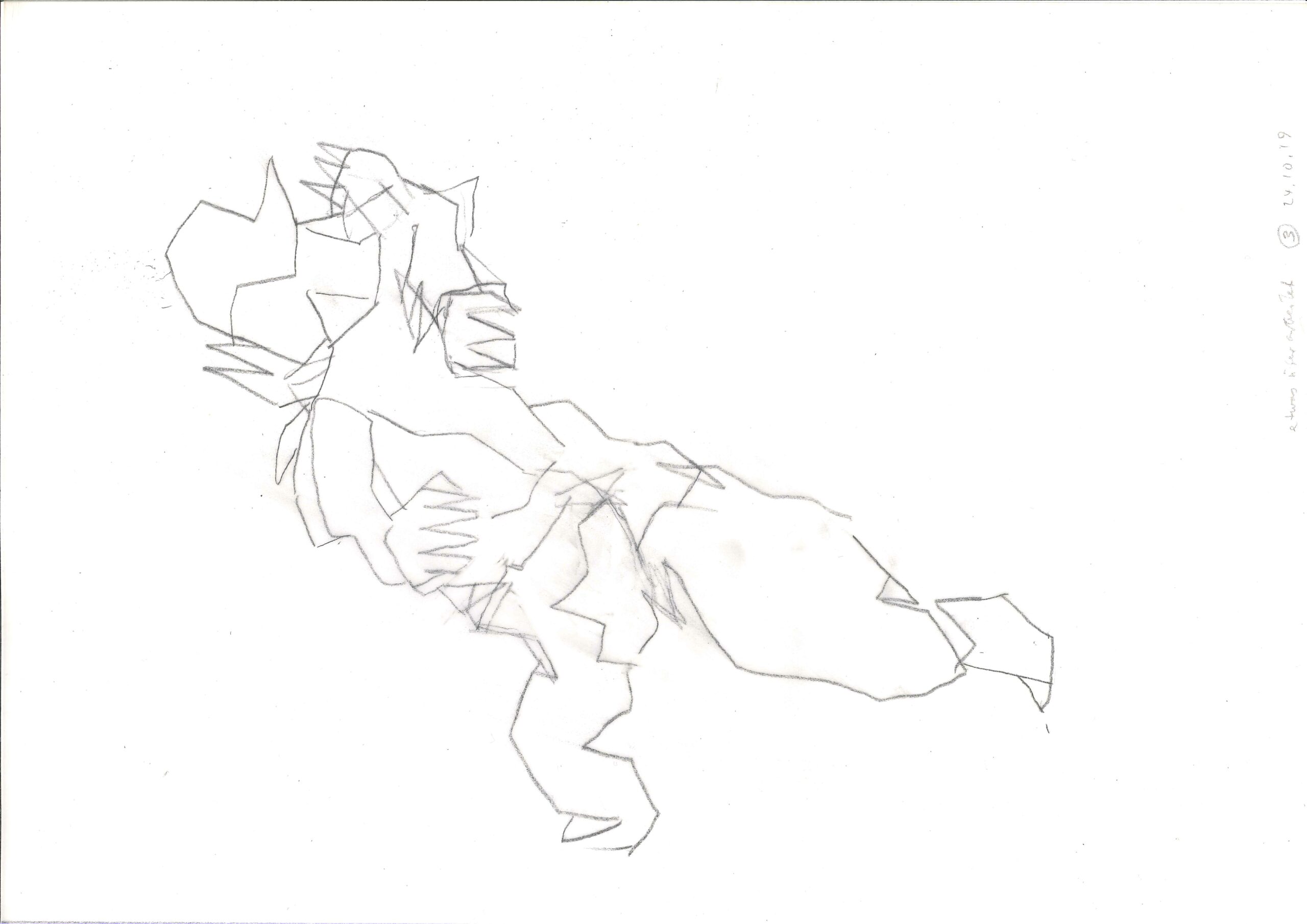 Choreografien mit den 6 Winkel verlaufen entweder kreisförmig oder laufen geradeaus. Diese zwei Kategorien generieren zahlreiche Varianten. Wird die Linie von Hand, ohne Hilfsmittel gezeichnet, ist ein unberechenbarer Verlauf die Regel. Schon kleine Abweichungen entsprechen nicht mehr der geometrischen Idee. Die entstandenen Netzstrukturen trösten mit Szenarien bewegter Figuren. Die Fragilität dieser Motive drückt sich im blitzartigen Auftauchen und gleichzeitigem Verschwinden aus. Interessant ist, dass die festgehaltenen Figuren wandelbar sind. Sie können aus allen vier Positionen zu neuen Gestalten mutieren.